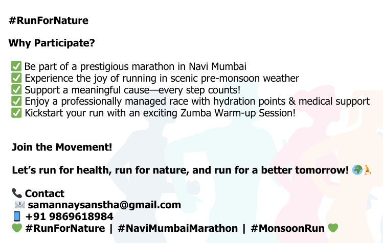 Lions Club Samanny, Vashi, Navi Mumbai,, proudly presents the Navi Mumbai Monsoon Marathon 2025 – Run for Nature, a high-energy running event that promotes fitness, environmental awareness, and social responsibility.29th June 2025 at Central Park, Kharghar, Navi Mumbai